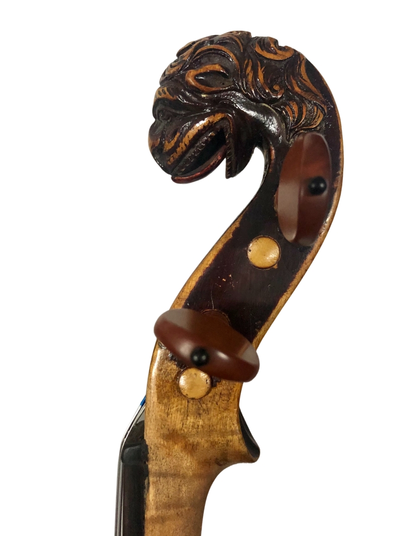Der Ahornboden ist einteilig mit leichter feiner Flammung. Die Ahornzargen sind ungeflammt. Durch den handgeschitzten Löwenkopf und das interessante Lackbild wird die Geige auch optisch zu einem Schmuckstück.