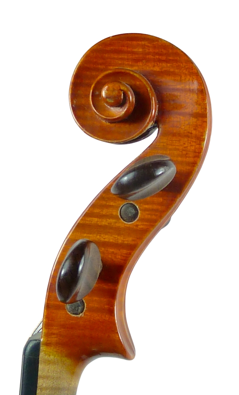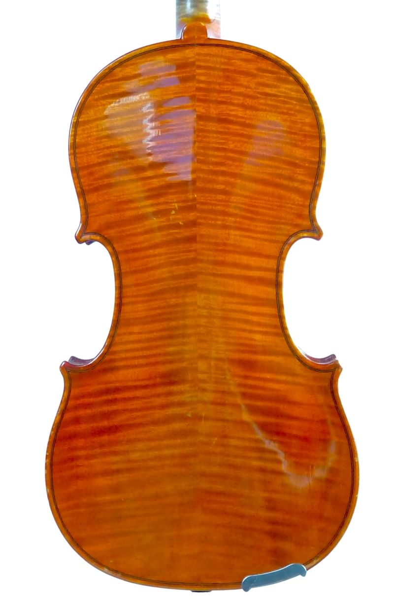 Der klare orange-gelbe Lack wurde gereinigt und aufpoliert, zeigt aber leichte Spielspuren. Die Violine ist eine gute Markneukirchener Arbeit aus den 1940 iger Jahren mit strahlend klarem Klang und modernem Charakter.