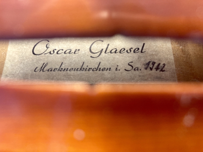 Diese alte Geige trägt innen im Boden den Original-Zettel von Oscar Glaesel.