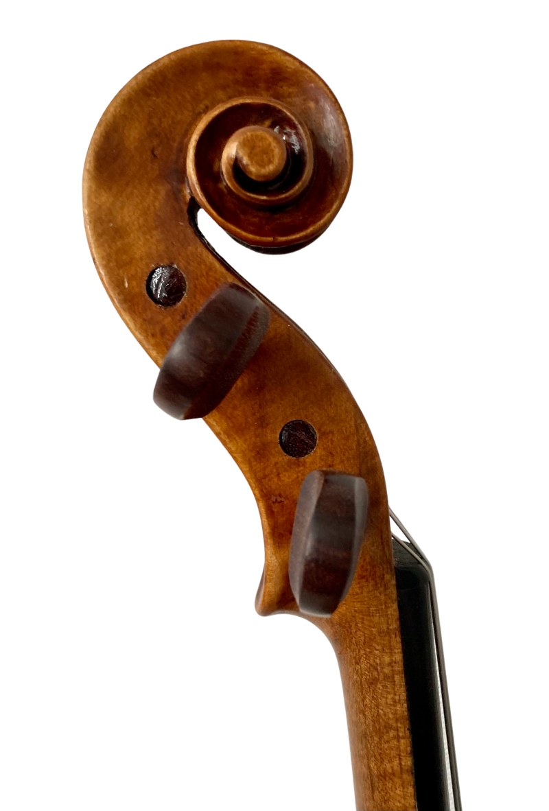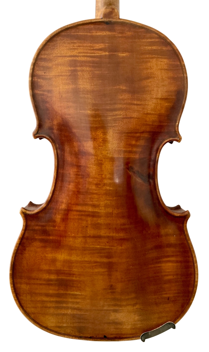 Diese 4/4 Violine wurde vermutlich um 1920 in Böhmen gebaut. Der Ahornboden ist einteilig mit lebhafter Flammung. Der helle goldbraune Lack mit Partina bringt die Flammung gut zur Geltung. Das Modell und die Wölbungen der antiken Violine an Decke und Boden zeigen, dass der Geigenbauer auf einen grossen, warmen Klang seiner Werke wert legte.