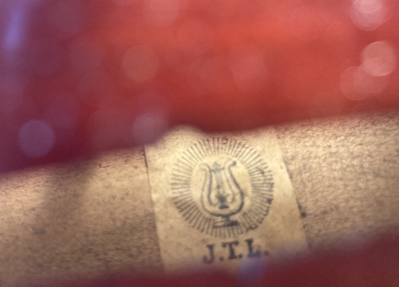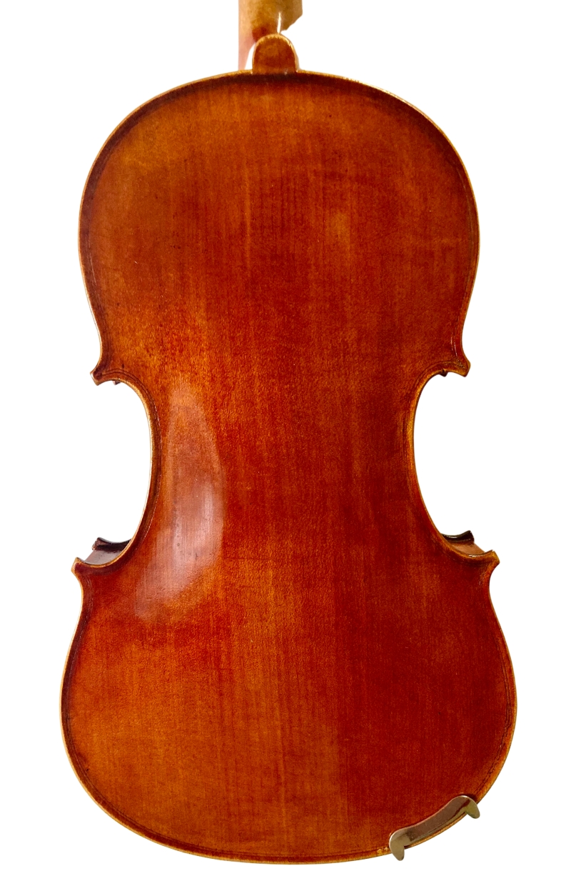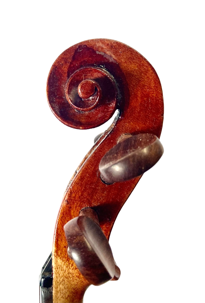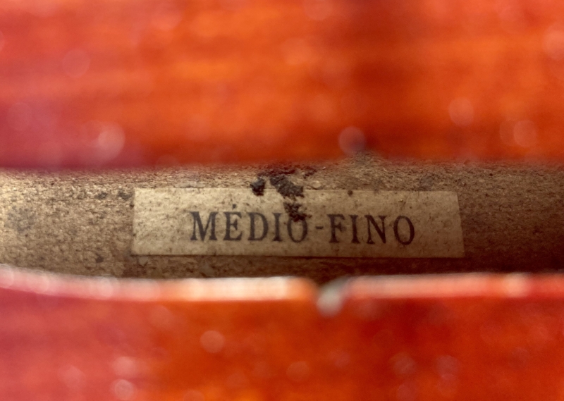 In unserer Geigenbauwerkstatt haben wir das Kinderinstrument gründlich durchgesehen und spielfertig hergerichtet. Es ist zwischen 100 und 120 Jahre alt. Bis auf einen alten kurzen, sicher geleimten Riss in der Decke zeigt das Instrument lediglich Spielspuren am Rand der Geige. Sie trägt den typischen, dunkel-bordeauxroten Sprituslack der Medio Fino-Reihe.